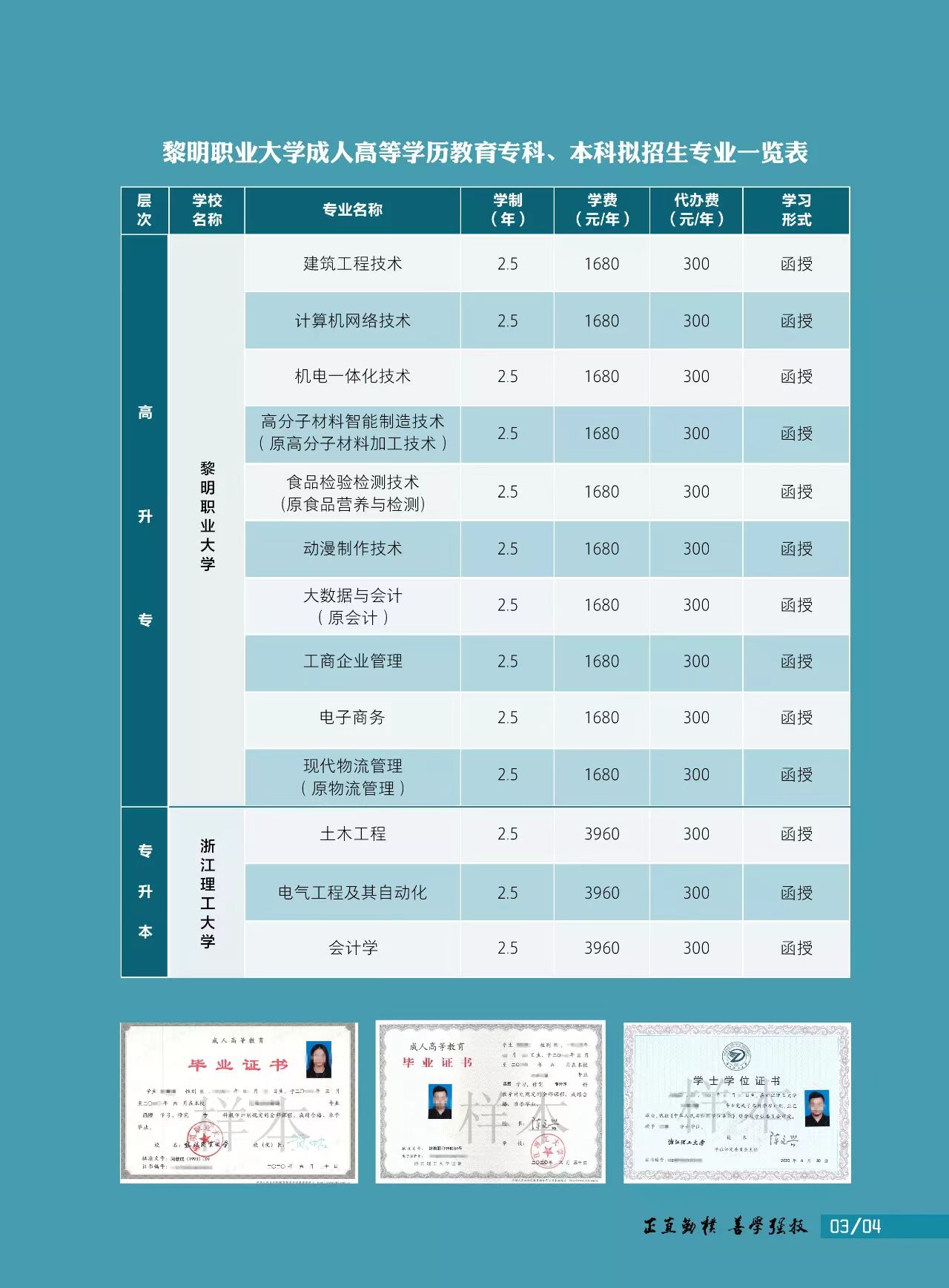 高起专:建筑工程技术、工程造价、机电一体化技术、高分子材料加工技术、食品营养与检测、计算机网络技术、会计、工商企业管理、电子商务