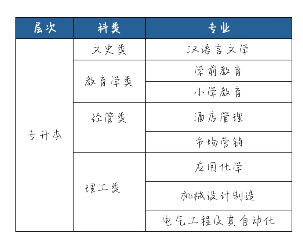 专升本:学前教育、小学教育、体育教育、汉语言文学、机械设计制造及其自动化、电气工程及其自动化、电子信息工程、土木工程、市场营销